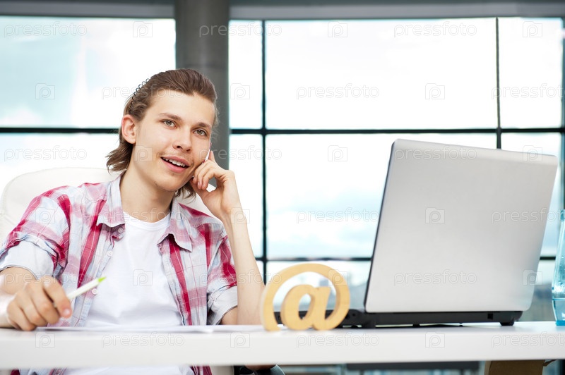 Мужчина в офисе с ноутбуком