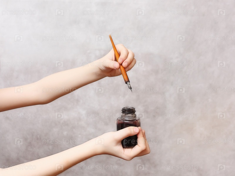 Перо и чернильница в руках