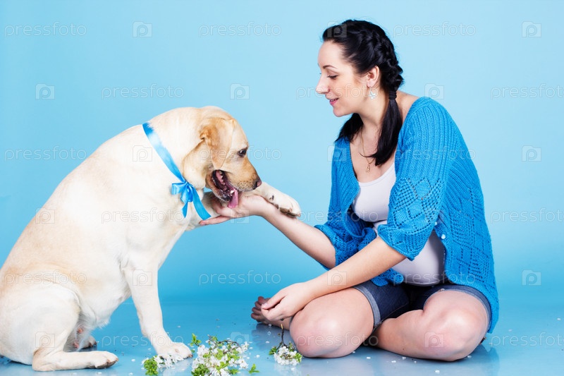 Девушка с собакой на синем фоне