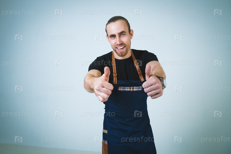 Молодой мужчина позирует на синем фоне