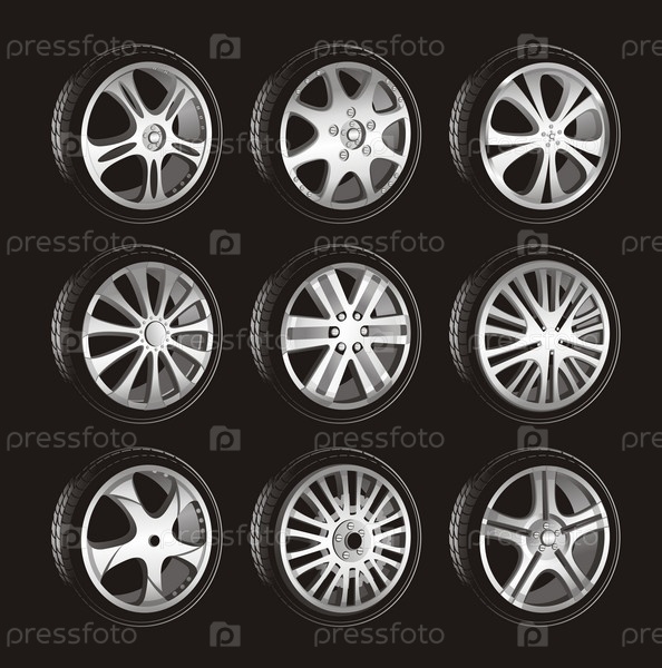 Автомобильные колеса с литыми дисками и низкопрофильными шинами на черном фоне