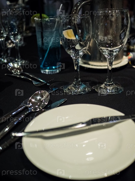 Бокалы для вина и тарелка на черном фоне