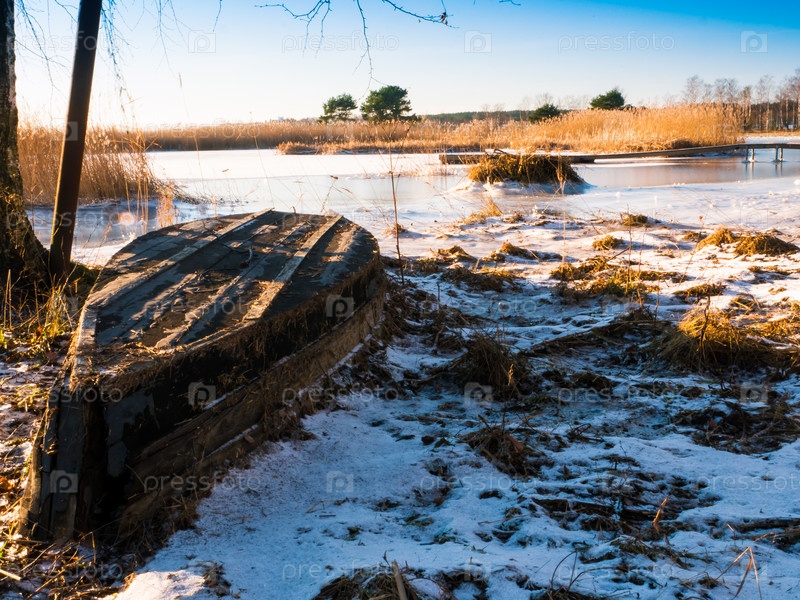 Лодка возле замерзшего озера. Зимний пейзаж