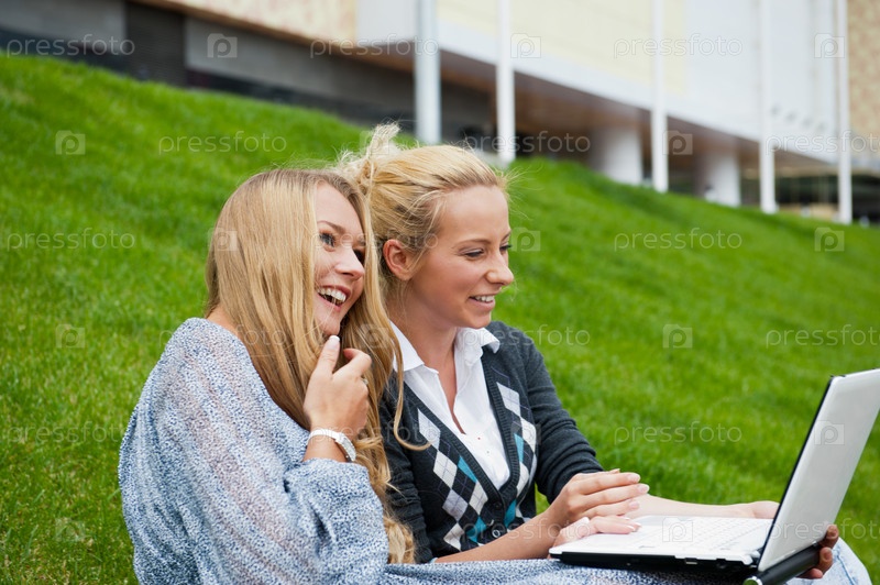 Две девушки с ноутбуком на зеленой лужайке в городском парке