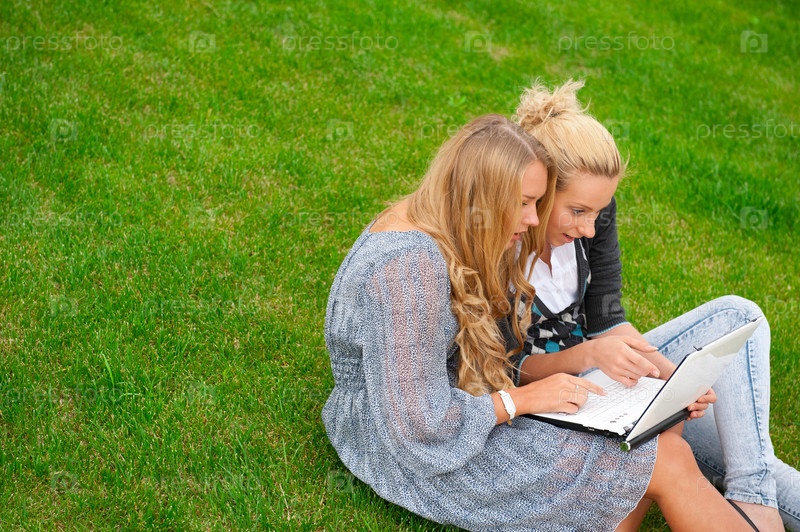 Две девушки с ноутбуком на зеленой лужайке в городском парке