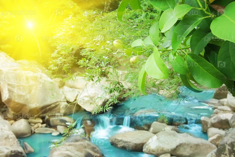 Ветки с зелеными листьями над маленьким голубым водопадом