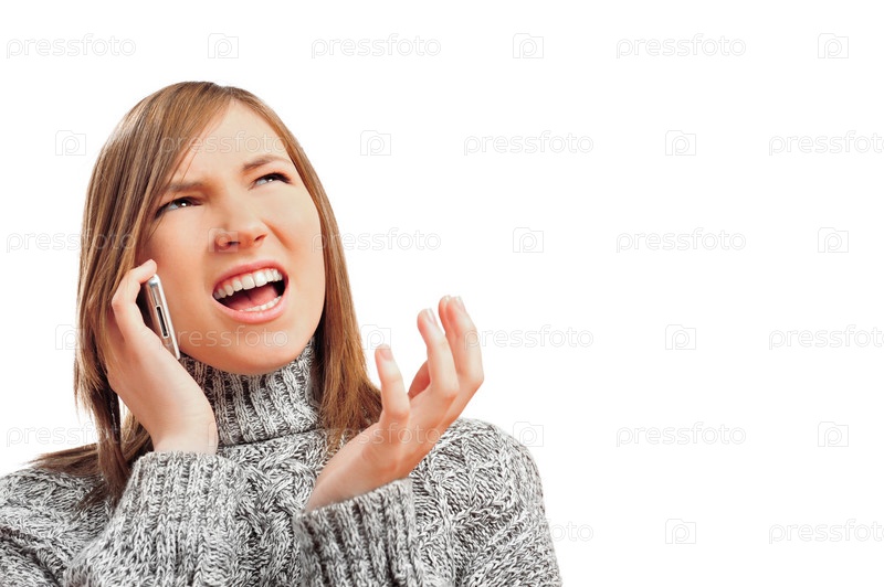Портрет удивленной молодой женщины, разговаривающей по мобильному телефону