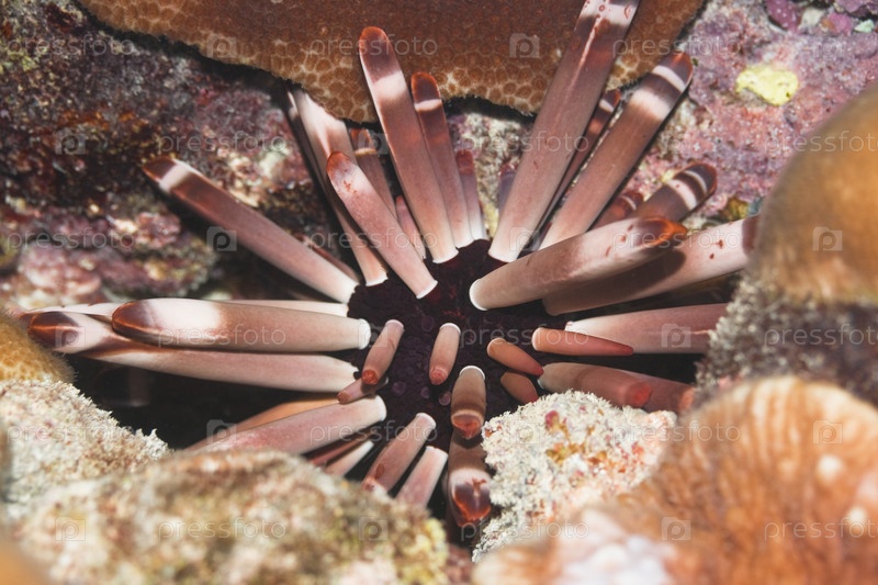 Морской еж среди камней на дне