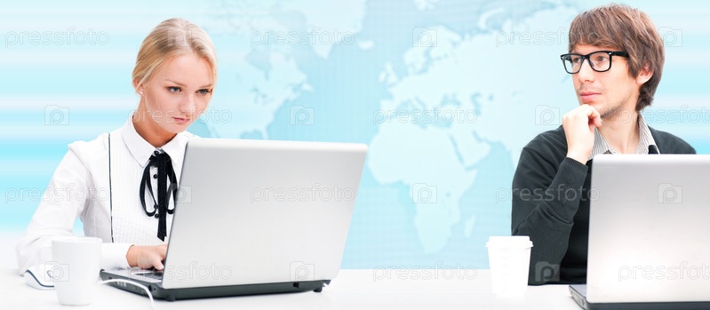 Коллеги на рабочих местах на фоне карты мира