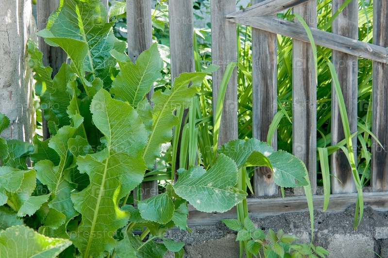 Листья хрена у деревянного забора