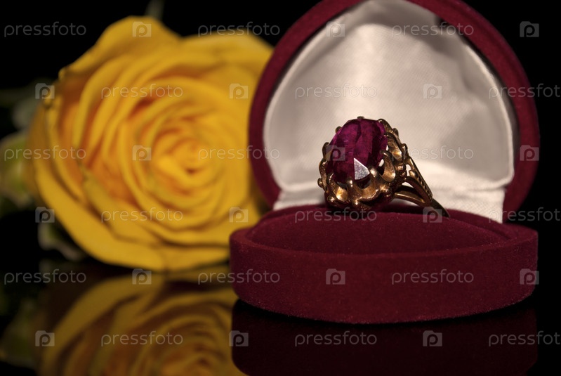 Желтая роза и кольцо с большим красным камнем в коробочке