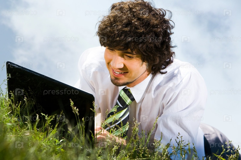 Портрет бизнесмена, лежащего на траве и печатающего на ноутбуке