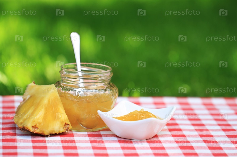 Ананасовое варенье и долька ананаса на скатерти на зеленой лужайке