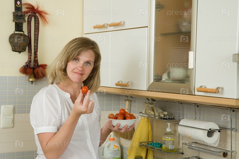 Беременная женщина на кухне с помидорами