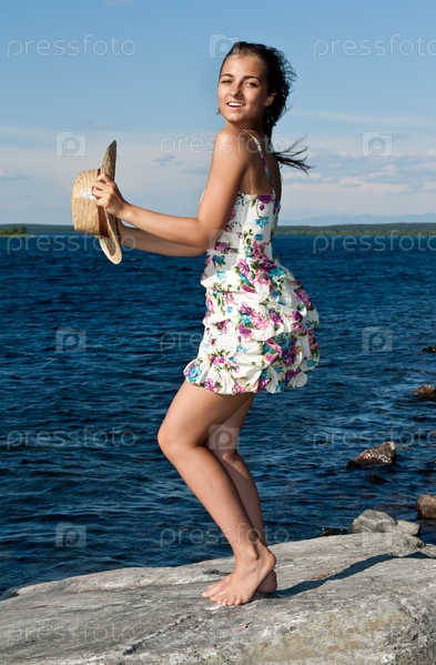 Девушка в соломенной шляпе на берегу озера