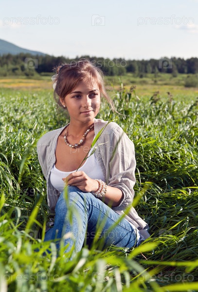 Красивая девушка сидит в зеленой траве