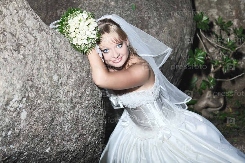 Красивая молодая невеста в свадебном платье на открытом воздухе
