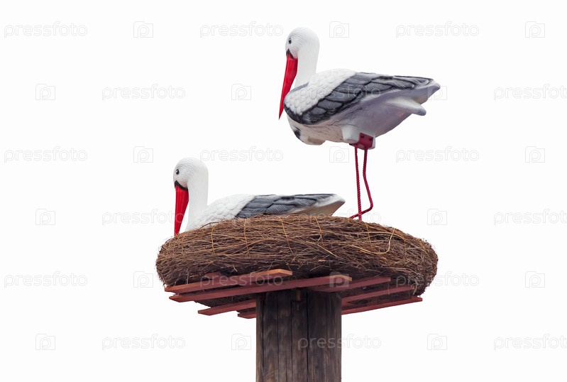 Скульптура аиста в гнезде на белом фоне
