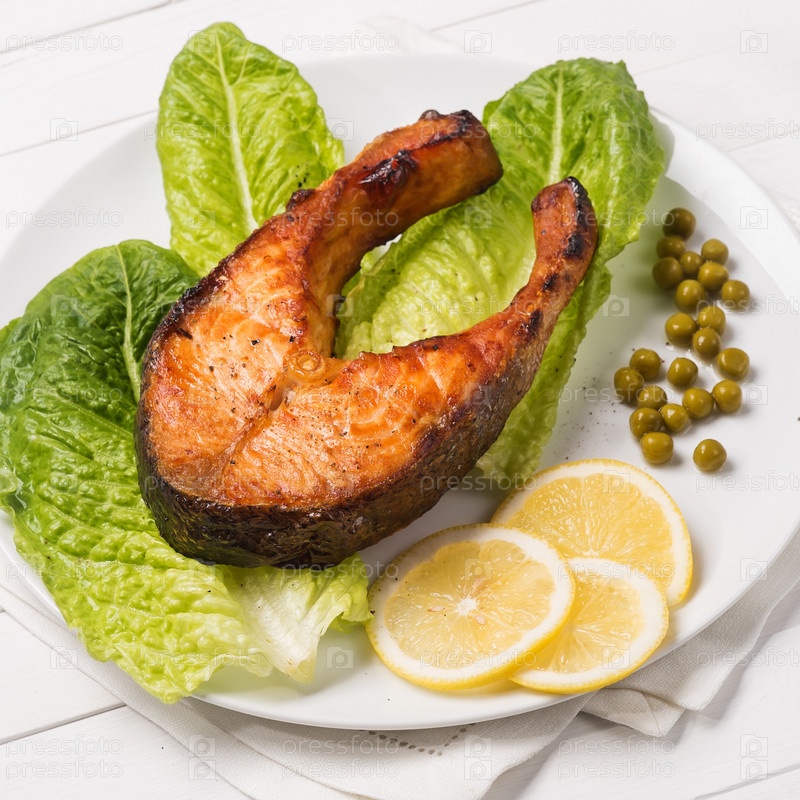 Жареная форель с салатом, лимоном и зеленым горошком