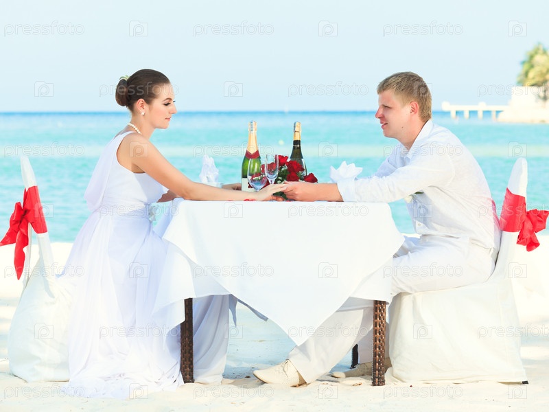 Жених и невеста на пляже за свадебным столом