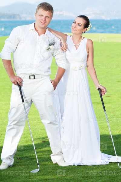 Жених и невеста играют в гольф в день свадьбы