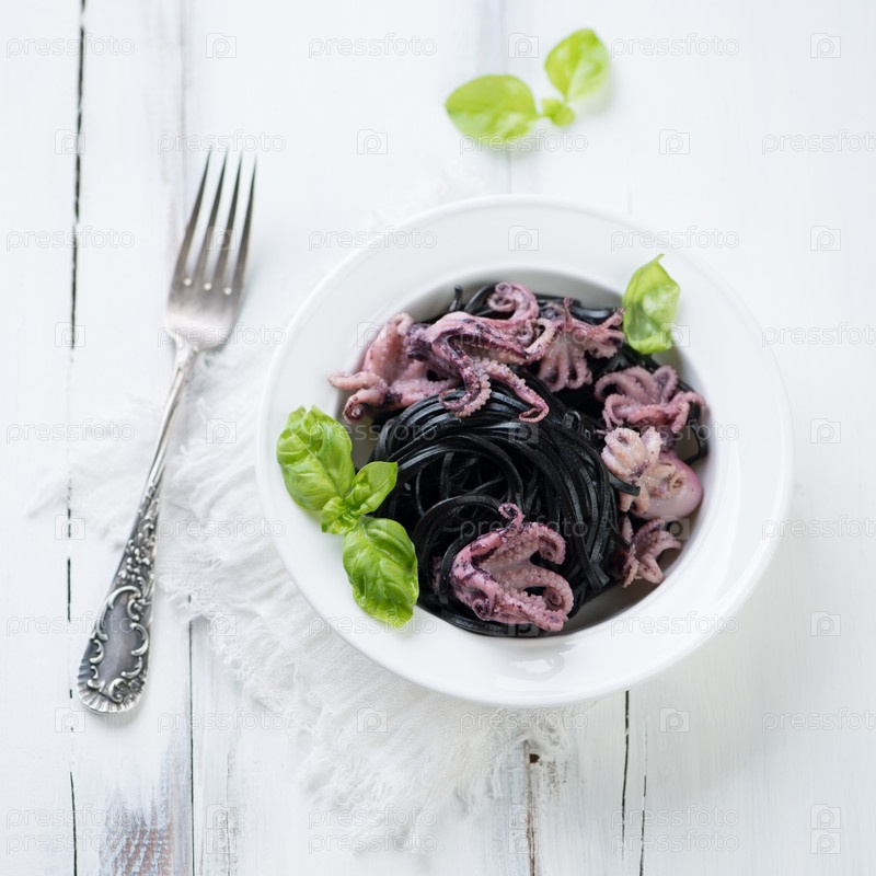 Черные тальятелле с осьминогами и базиликом