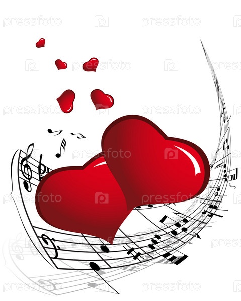 Красные сердца и музыкальные ноты на белом фоне