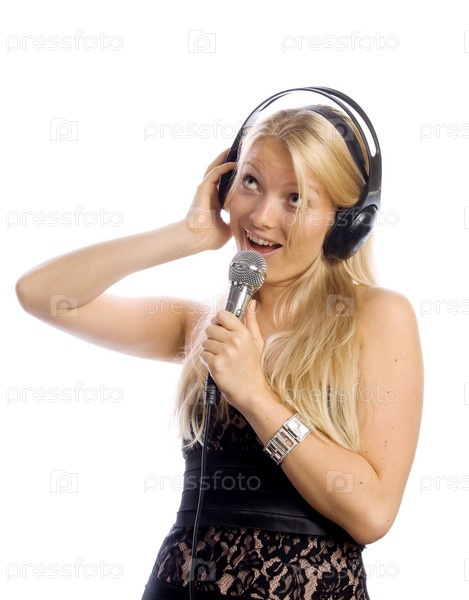 Девушка в наушниках поет в микрофон