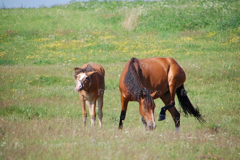 Лошадь с жеребенком на пастбище