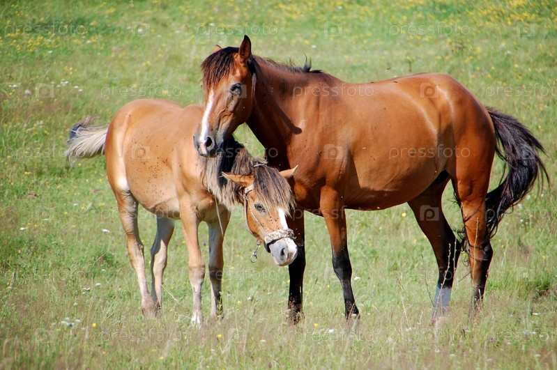 Лошадь с жеребенком на пастбище