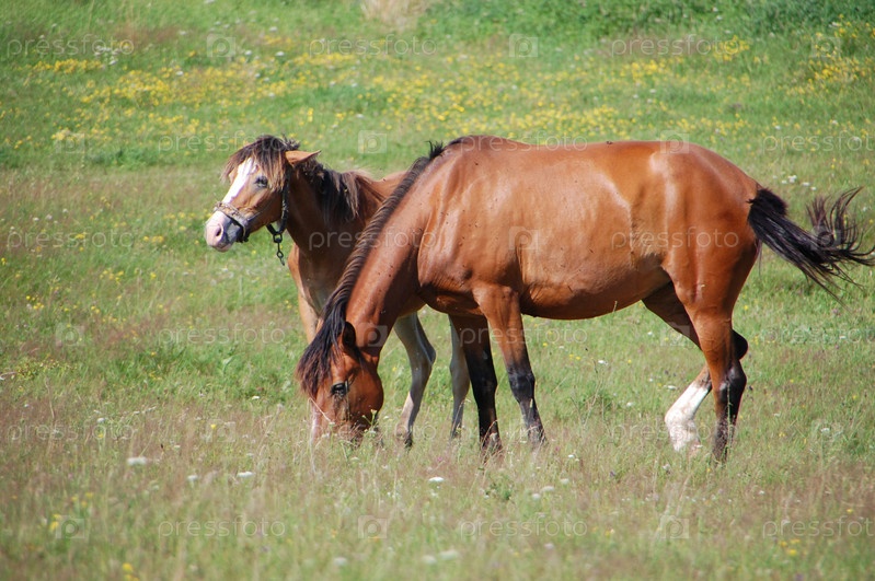 Лошадь с жеребенком на пастбище