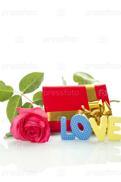 Красная роза, подарок и слово "Любовь" на белом фоне