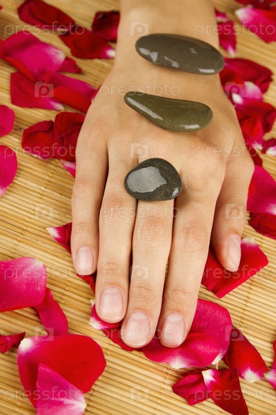 Женская рука с морскими камнями и лепестки роз на циновке