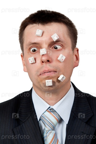 Слово 'STUPID' выложенное кнопками на лице бизнесмена на белом фоне