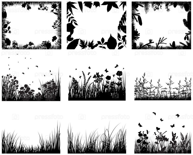 Коллекция из силуэтов трав и рамок на белом фоне