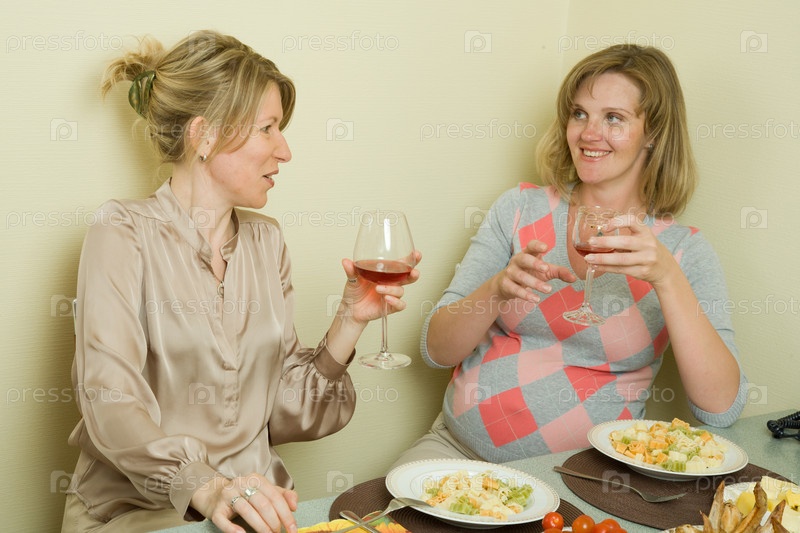 Беременная женщина с подругой кушают на кухне