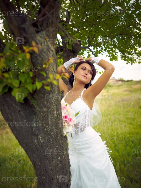 Красивая молодая невеста в свадебном платье на природе