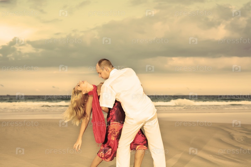 Молодая влюбленная пара, танцующая на песчаном морском пляже