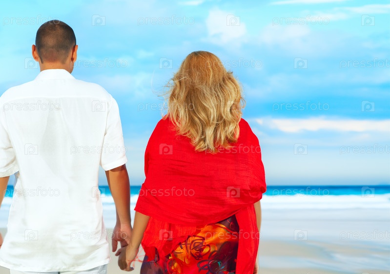 Молодая влюбленная пара на песчаном пляже смотрит на море, держась за руки