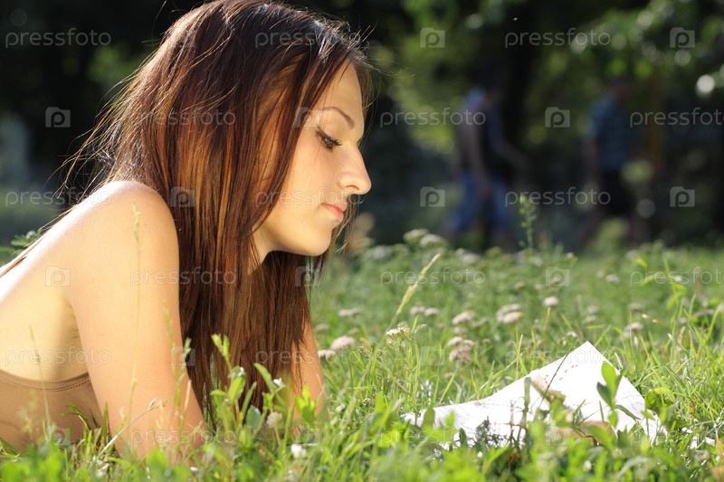 Молодая девушка с книжкой в парке лежит на траве