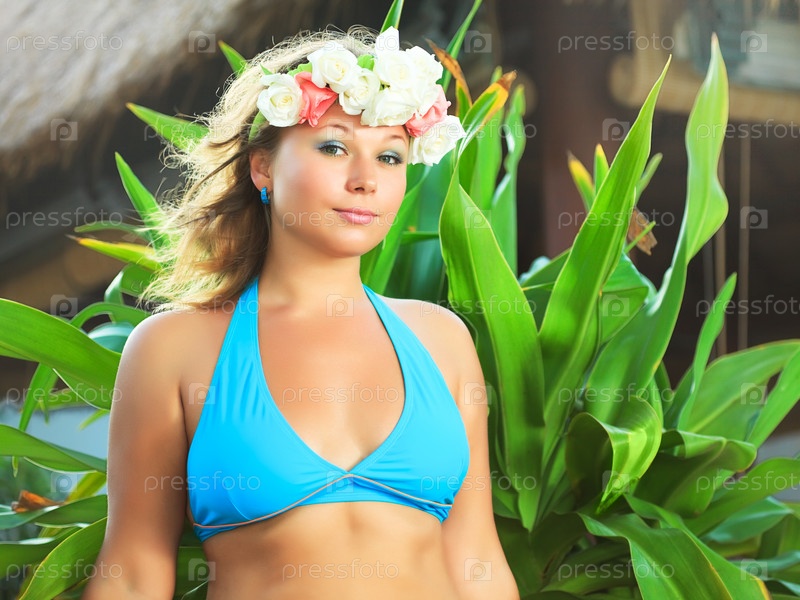 Портрет девушки в бикини и с цветочным венком на голове на курорте