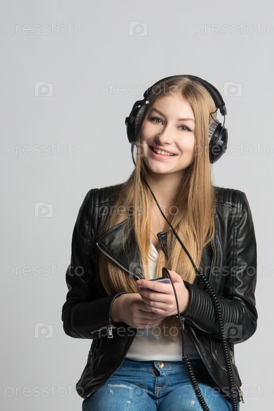 Девушка в проводных наушниках слушает музыку