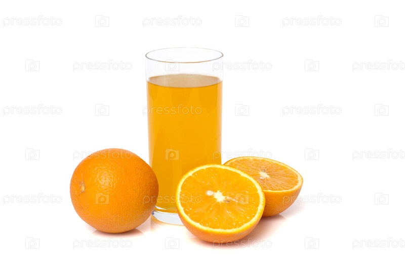 Апельсиновый сок и апельсины на белом фоне