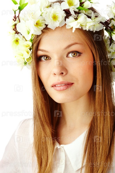 Девушка с венком из цветов, на белом фоне