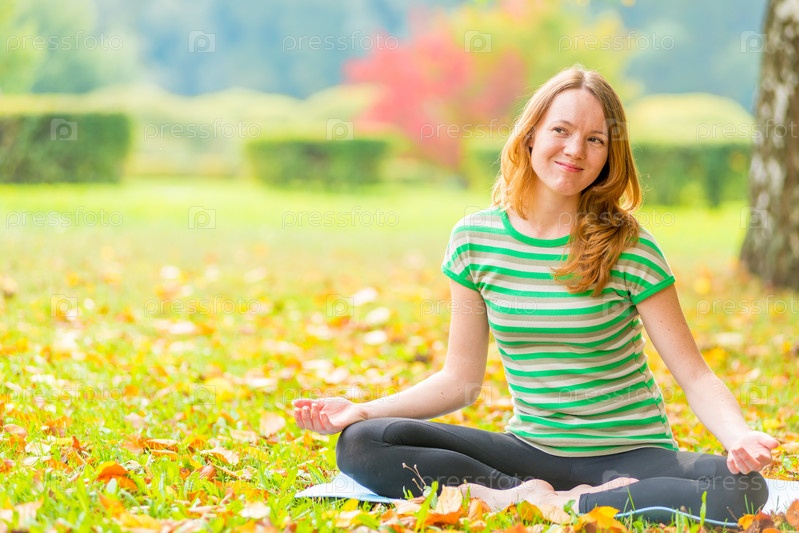 Улыбающаяся девушка занимается йогой в парке