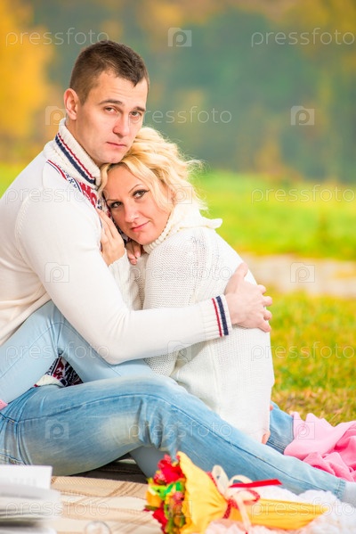 Любящая пара обнимается, сидя в парке