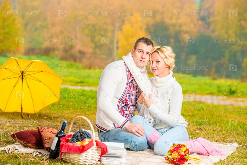 Молодая пара на пикнике в осеннем парке