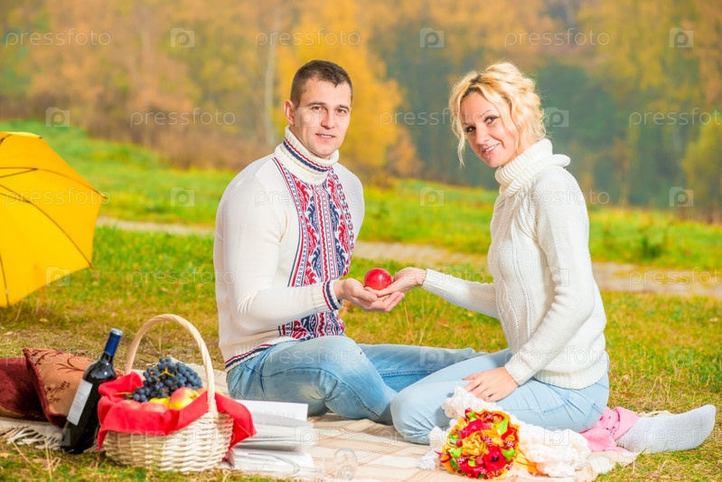 Мужчина и женщина держат в руках красное яблоко