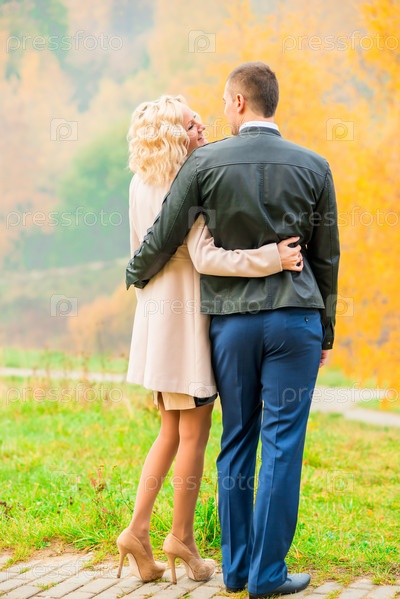 Молодая пара обнимается в осеннем парке