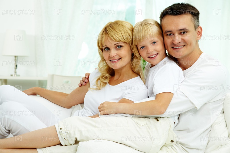 Счастливая семья из трех человек дома на диване
